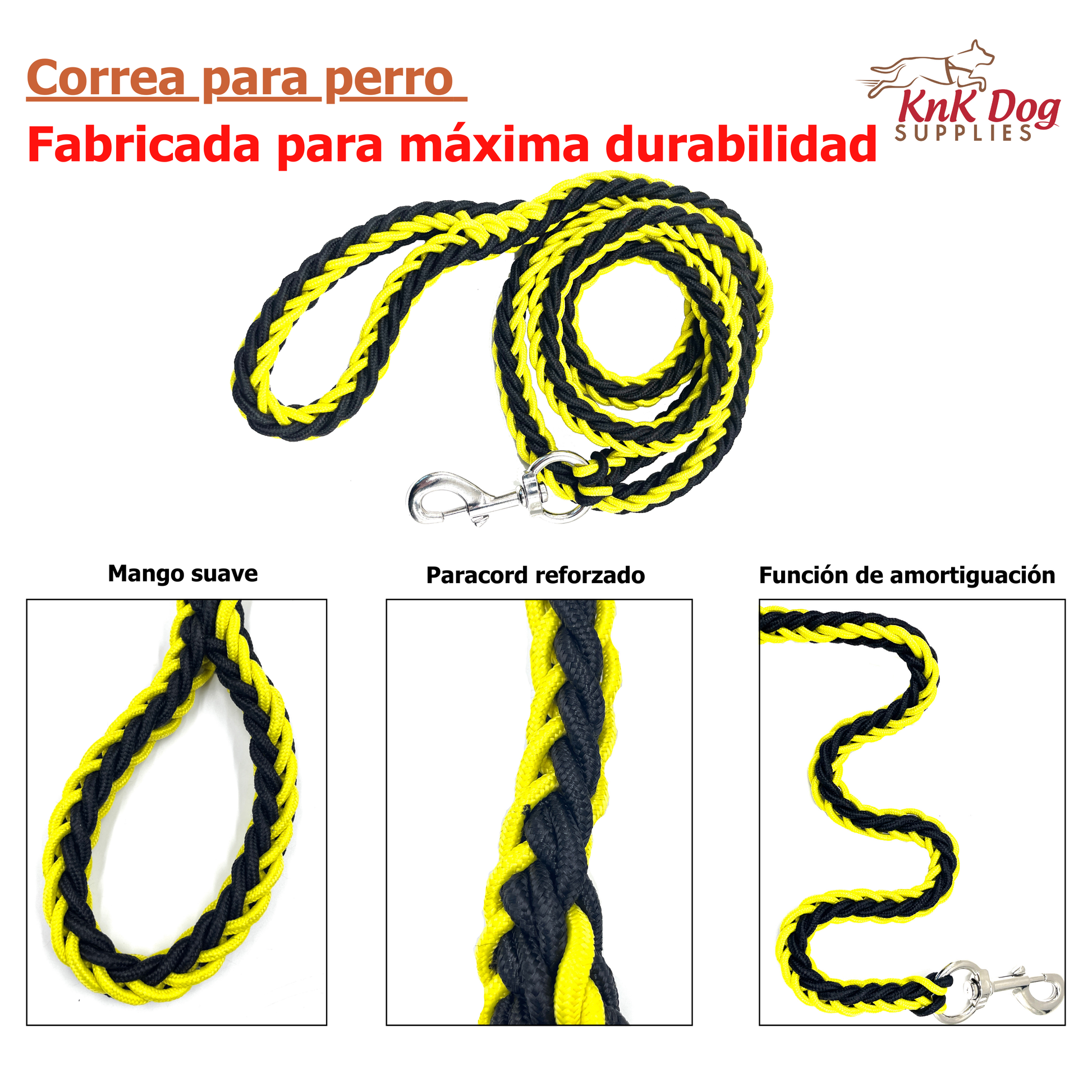 Duradera, funcional y con el distintivo diseño negro y amarillo KnK, esta correa está hecha para dueños que buscan rendimiento, no accesorios.
