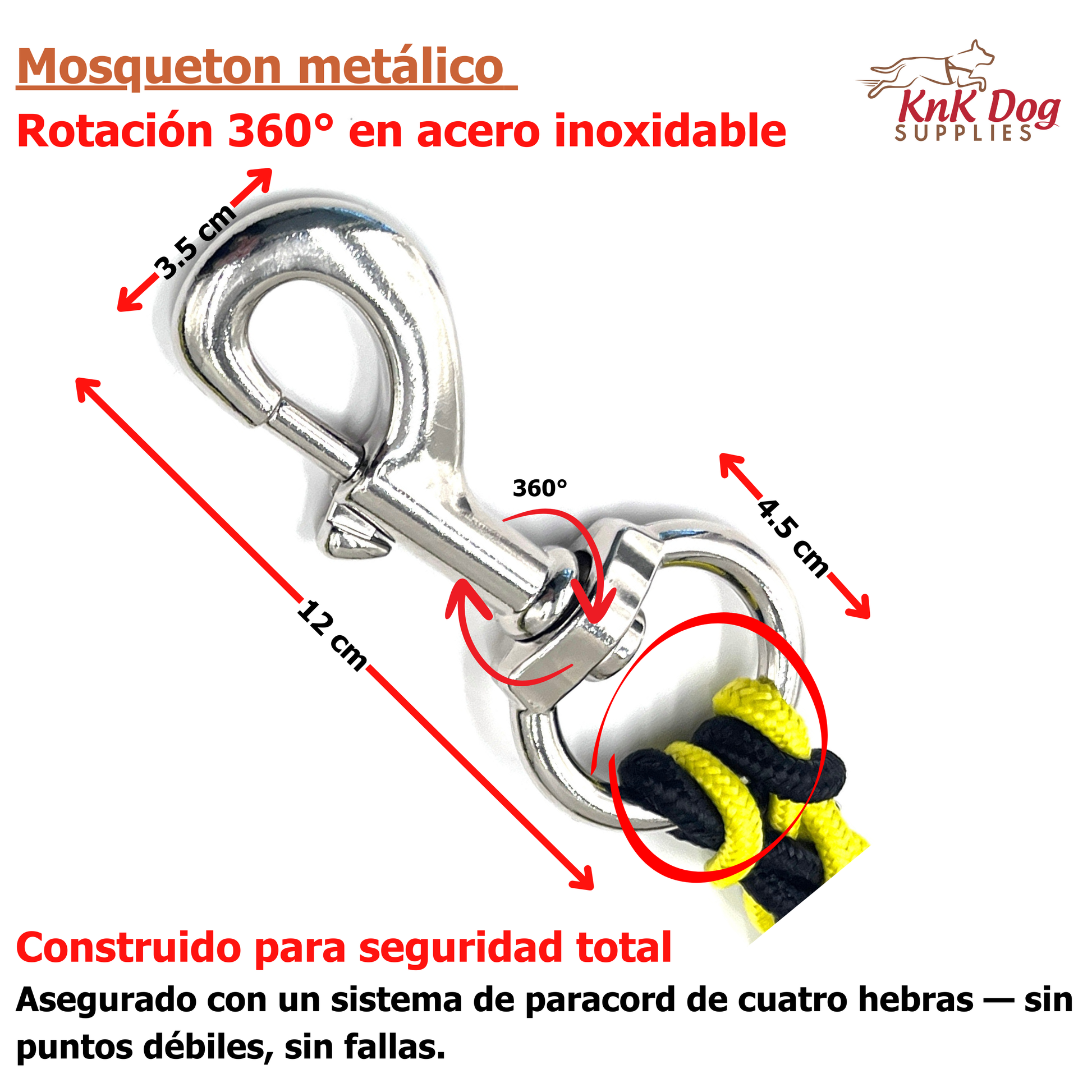 - Mosquetón: Mosquetón metálico de alta resistencia con giro de 360° para evitar enredos